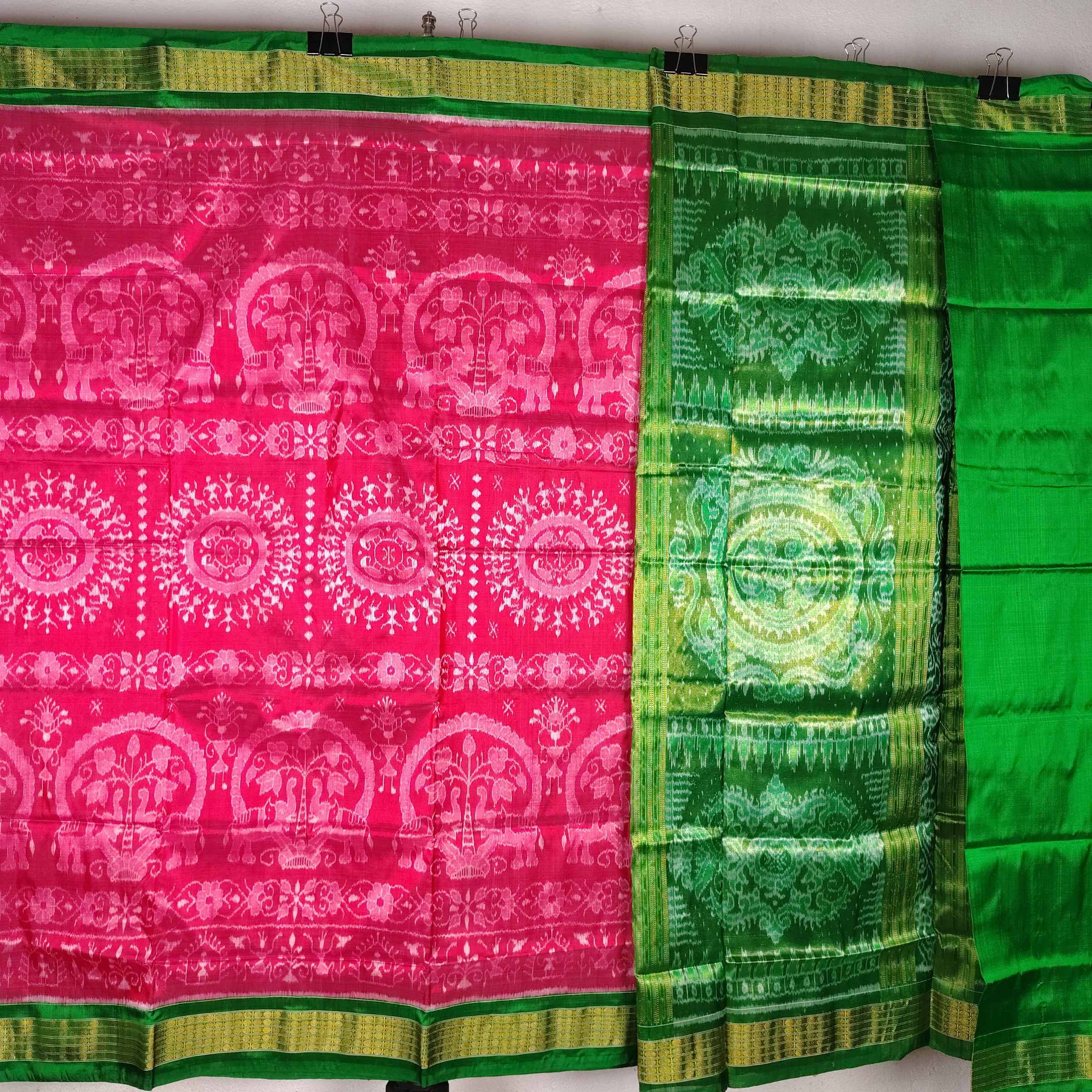 Rani Pink Green Elephant Terracotta Half Tissue Saree