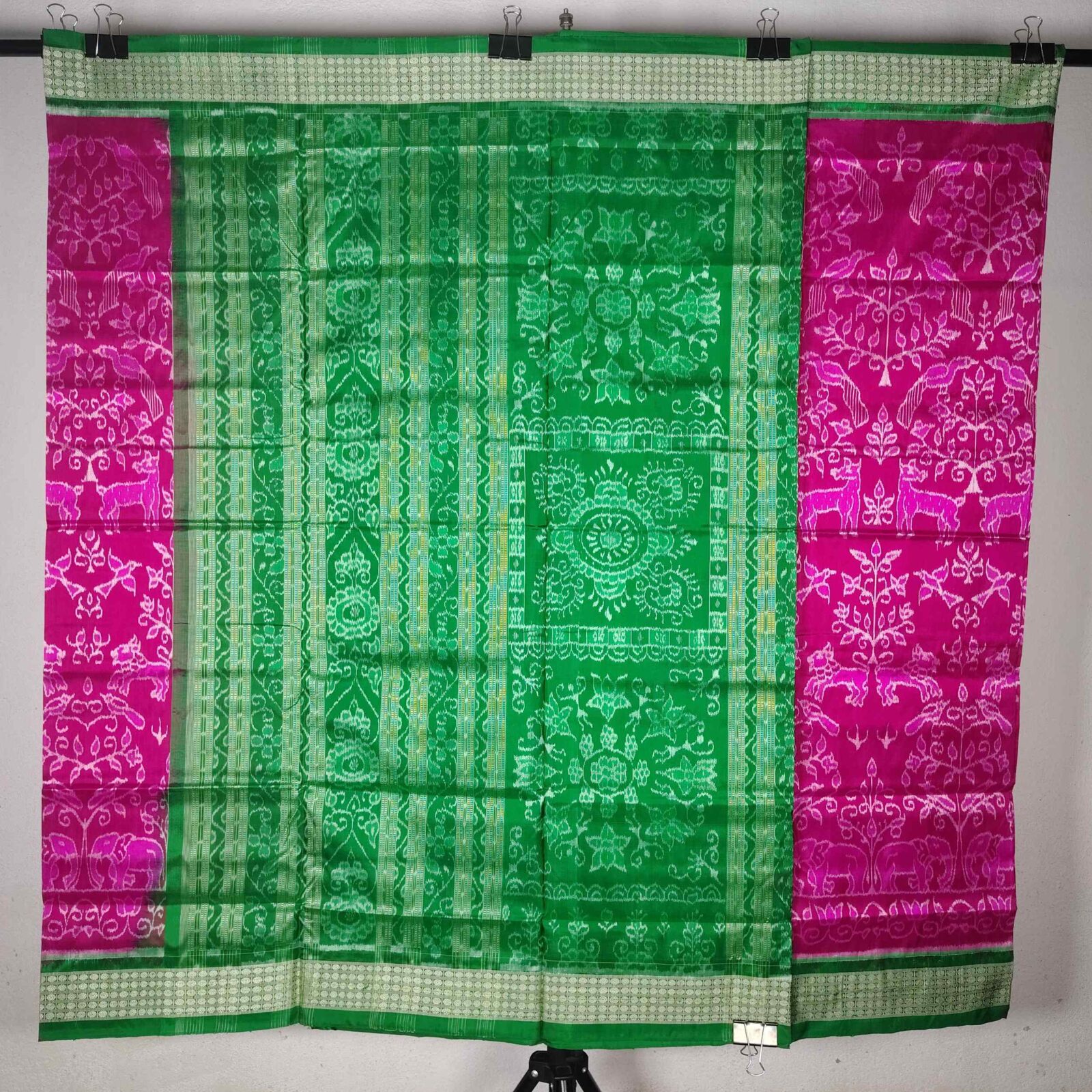 Pink Green Jungle Theme Sambalpuri Silk Saree