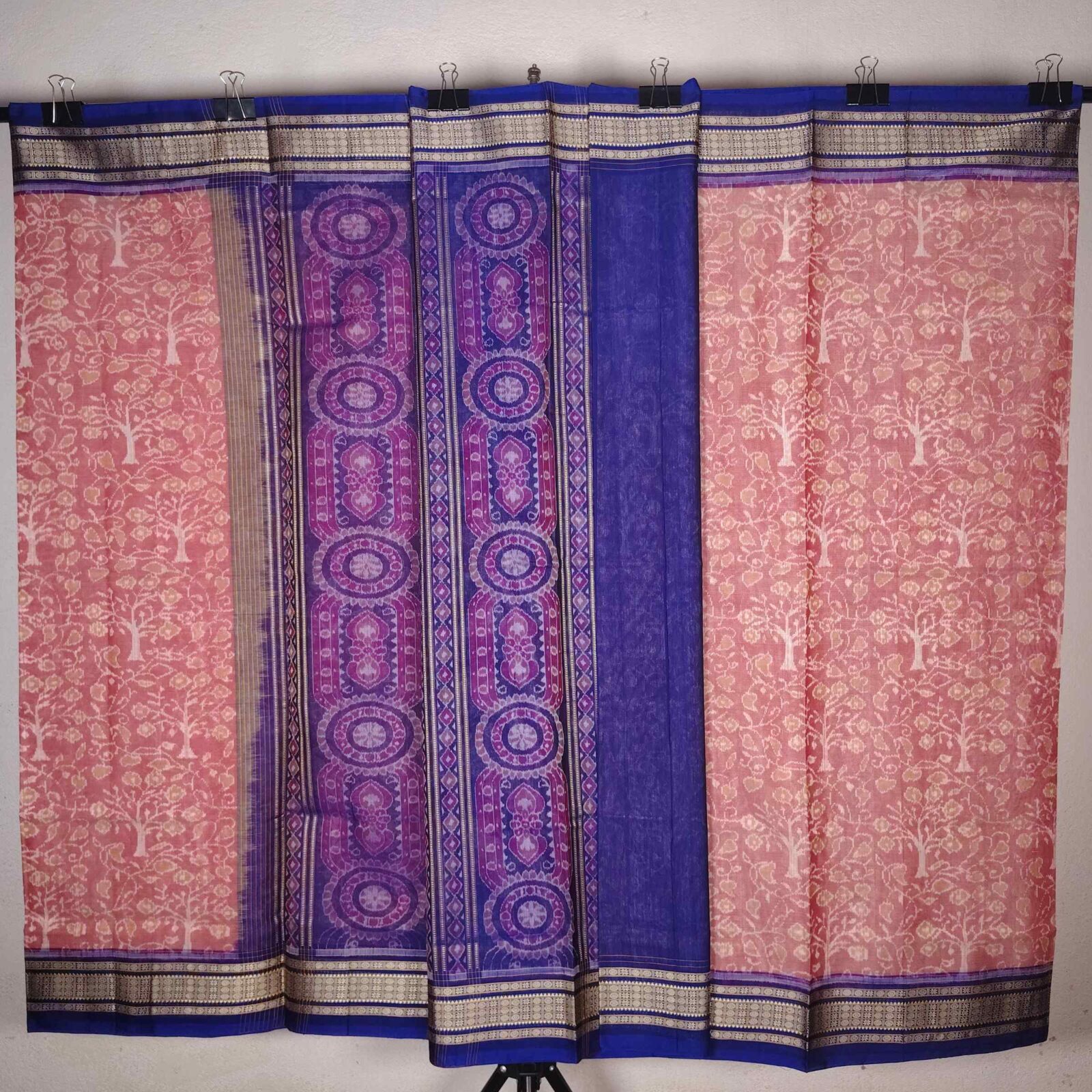 Light Pink Blue Leaf Tree Cotton Silk Saree