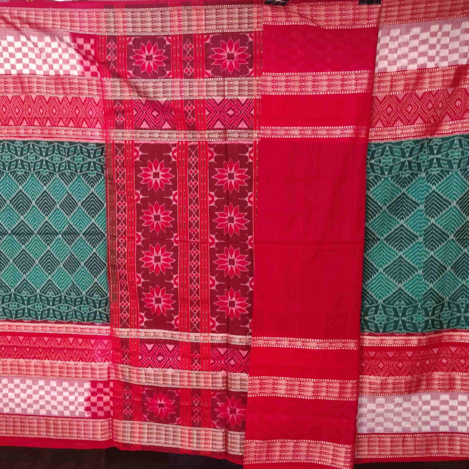 Green Red Geometric Pattern Cotton Saree