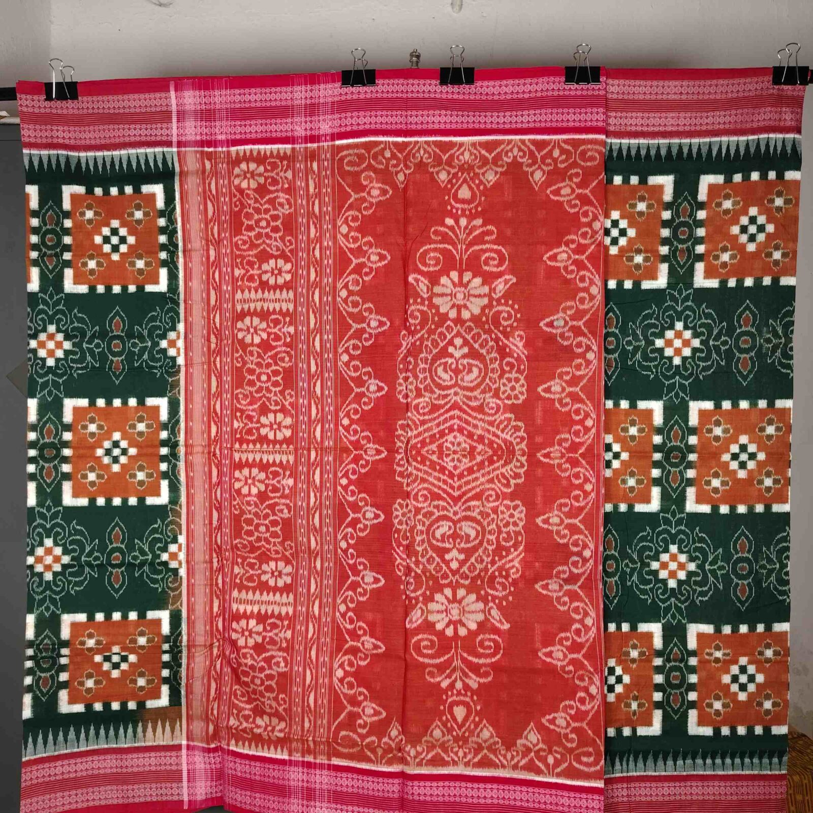 Dark Green Yellow Red Sapta Milan Cotton Saree